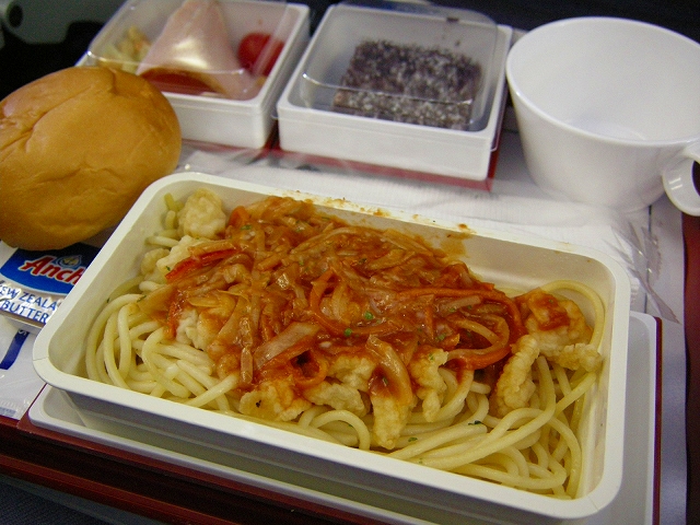 行きと基本変わらず、牛丼とカレーだったのがパスタと中華風炒め物になり、